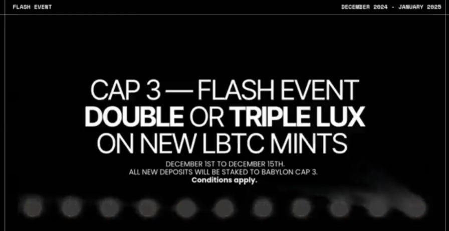 Lombard’s Babylon Cap-3 Flash Event is now live. Users can mint a minimum 0.001 LBTC before 15 Dec 11:00 UTC, and hold it either in a wallet or whitelisted DeFi until 5 Jan 11:00 UTC to join the event. All new LBTC minted will receive a double Lux boost. Existing users that double their stake before Dec 15 will be eligible for triple rewards.