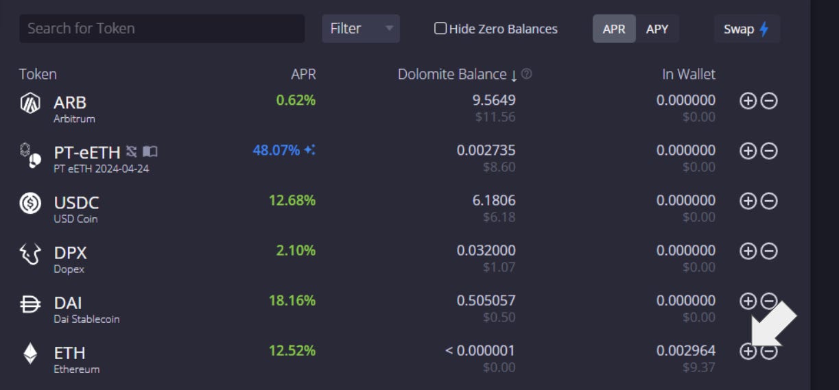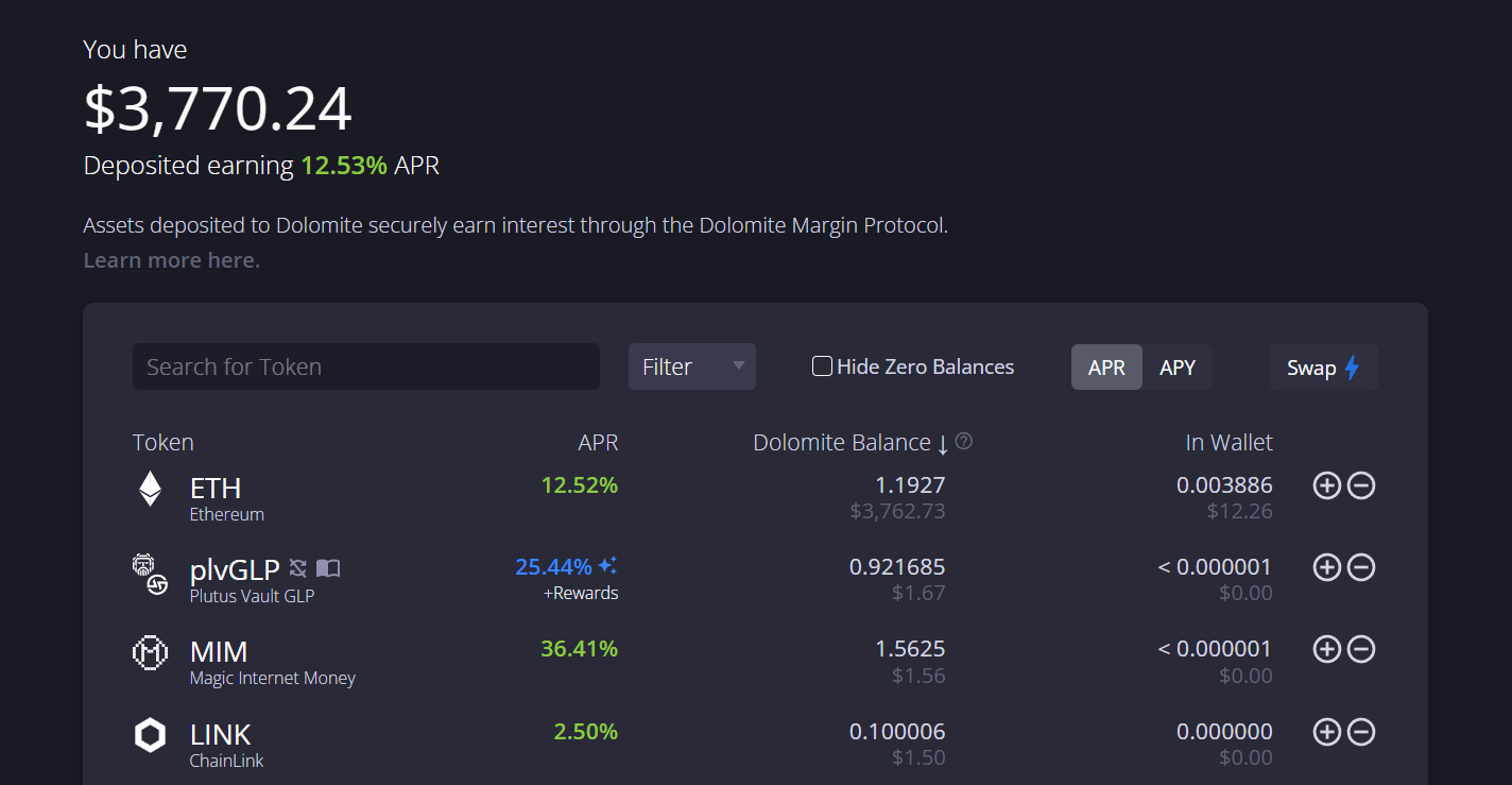 The Balance function allows users to utilize the liquidity supplied to Dolomite simultaneously across lending, swapping, and borrowing. Through bundling the transactions, users can easily create leveraged lending positions on Dolomite to earn multiplied yields.