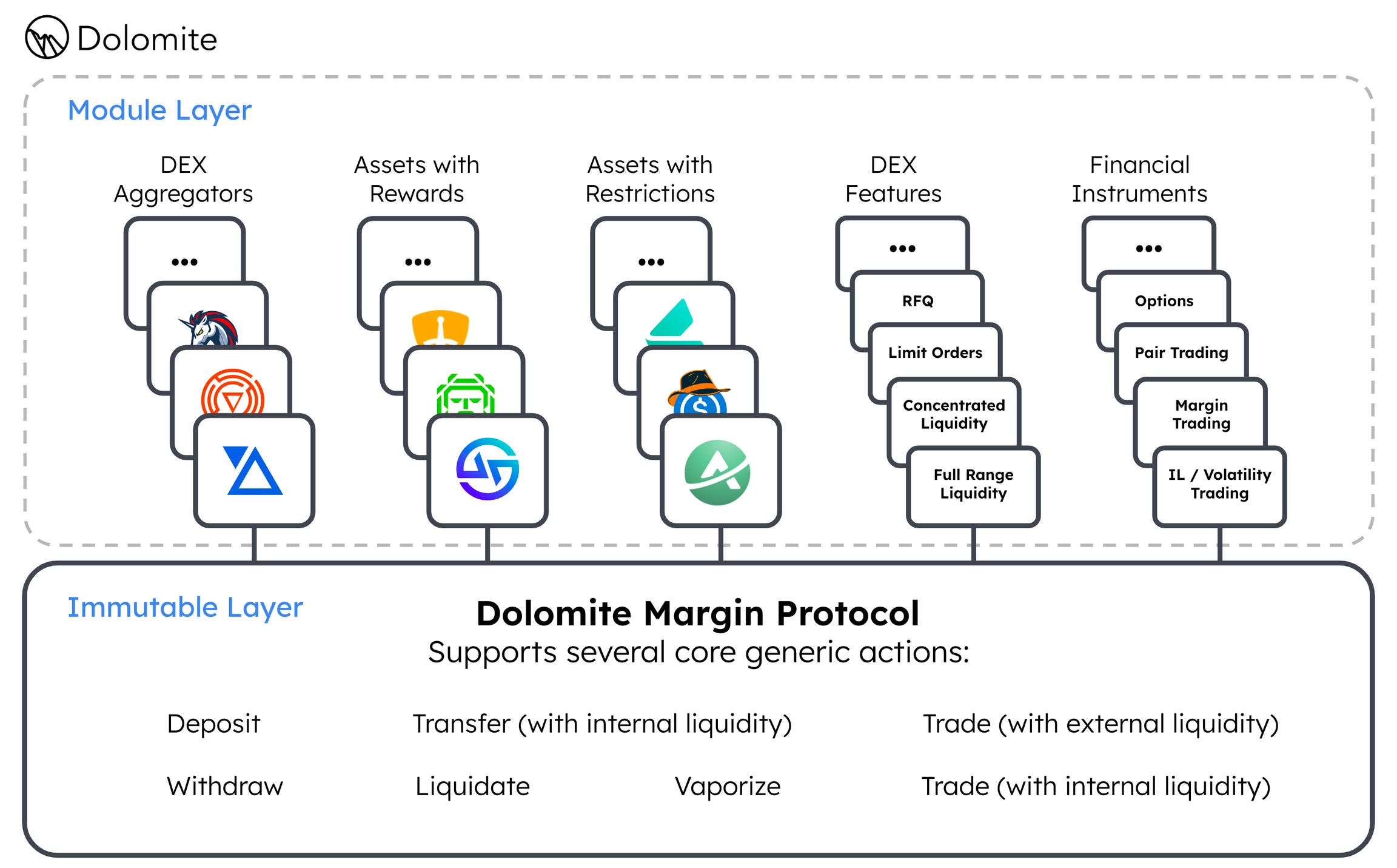 Dolomite has a modular architecture that's composed of two layers - the core (immutable) layer & the module (mutable) layer. The immutable layer safeguards the users’ assets and protects the protocol from malicious attacks, while retaining a high level of modularity to adapt to new environments, trends, and paradigms as DeFi continues to evolve.