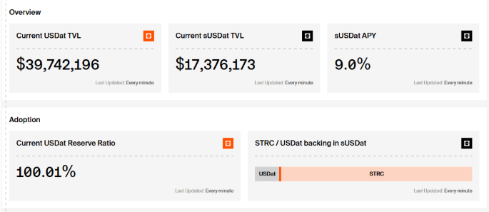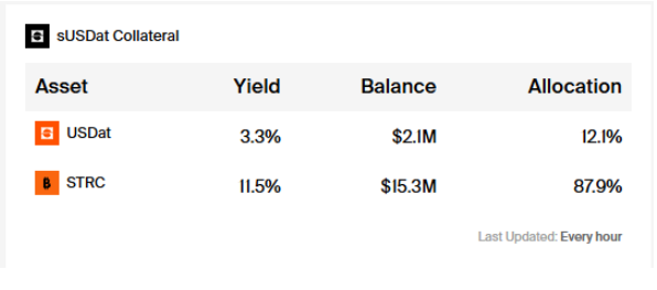 The Yield Vault (sUSDat): When USDat is staked, users receive sUSDat, an ERC-4626 standard yield-bearing vault token. The underlying collateral is reallocated into STRCâa perpetual preferred equity instrument collateralized by corporate Bitcoin balance sheets. To optimize returns while maintaining operational liquidity, the sUSDat vault ($17.3M total) utilizes a blended allocation: