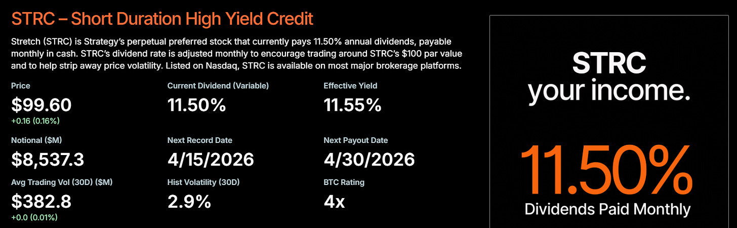 88.5% STRC ($15.3M): The core yield engine, capturing the 11.5% dividend rate generated by the Bitcoin-backed corporate credit.