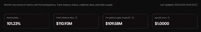 The Yield Layer (apyUSD) & Treasury Composition: Market participants holding apyUSD capture the dividend streams generated by the underlying DAT shares, with apyUSD systematically appreciating against apxUSD as off-chain cash flows are realized. To fuel this, Apyx maintains a highly concentrated treasury. Current data shows a total collateral balance of $110.93M against a circulating supply of $109.58M (approx. 101.2% overcollateralization), composed of: