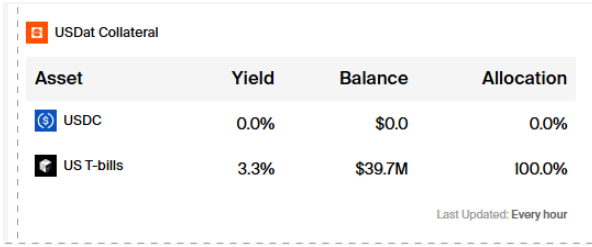 The Monetary Base (USDat): Designed strictly for settlement and liquidity, USDat is minted at a 1:1 ratio. To maximize stability and insulate the primary settlement layer from credit market volatility, the USDat reserve ($39.6M) is currently allocated 100.0% to US T-bills, which generate a conservative baseline yield of 3.3%.
