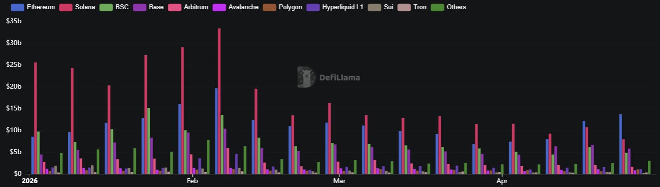 Ethereum is back at #1 in weekly DEX volume (~$13.5B) â the first time since early February. Solana, which has led most weeks of 2026, dropped to roughly $8B and continues its deceleration from the $25-30B February peaks.