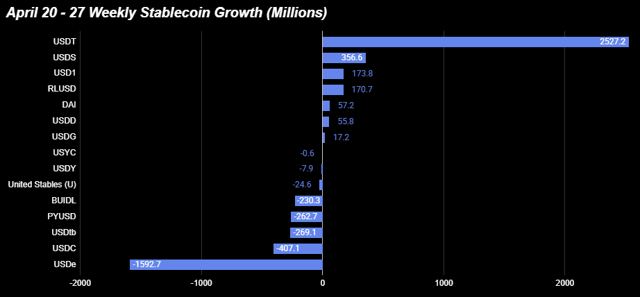 USDe -$1.59B (-32%) â the move of the week. Ethenaâs synthetic dollar lost a third of its supply in a single week. The mechanism: most USDe was used as liquid leverage on Aave (farmers borrow USDC and USDT against sUSDe to amplify Ethenaâs basis yield). When the Kelp DAO exploit froze Aaveâs WETH markets and pushed stablecoin borrow rates to extremes, those leverage strategies flipped to negative carry â forcing widespread unwinds. Each unwind redeems USDe.
