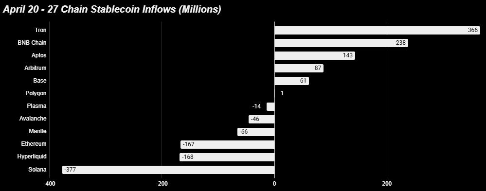 While HyperEVMâs 3% outflow is primarily caused by Purrlendâs $1.5M exploit, the chains absorbing capital are the ones that act primarily as USDT payment rails: Tron, BNB Chain, and Aptos (the +8.87% on Aptos is the biggest % gain on the board).