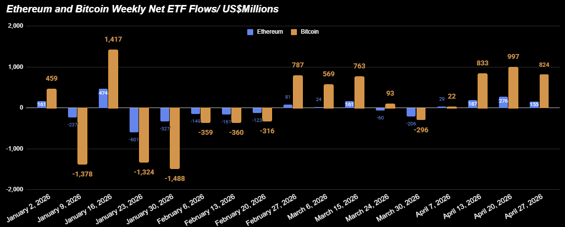 BTC +$824M (9-day inflow streak), ETH +$155M. Combined $979M â fourth straight week of strong inflows, with $2.44B absorbed in April alone (highest since October 2025). Institutions are stacking exposure ahead of Wednesday's FOMC, even with Kelp aftermath and geopolitical tensions remains unresolved.