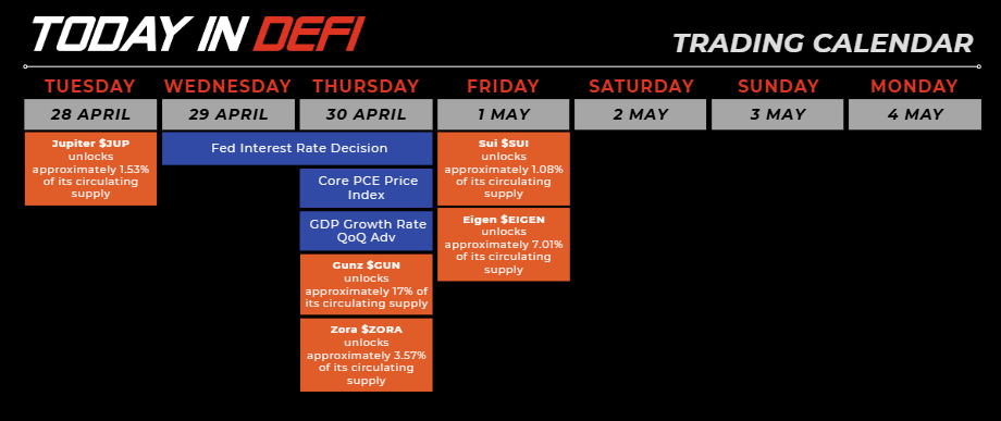 A heavy macro week ahead. Tue Apr 28 â US Consumer Confidence. Wed Apr 29 â FOMC decision + Powell press conference (98% probability of a hold at 3.50-3.75%, possibly Powellâs last meeting before Warsh transition May 15). Thu Apr 30 â US Q1 GDP + March PCE inflation. Apr 27-29 â Bitcoin Conference Las Vegas, historically market-moving.