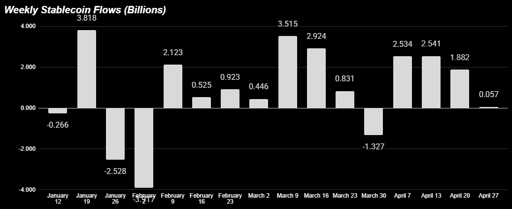 Weekly flow: +$57M (+0.02%). This is the lowest weekly print since the contractions in early February. Net stablecoin growth has effectively stopped.