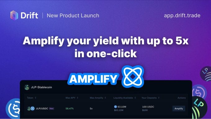 Drift Protocol has launched Amplify, a new feature that loops positions with automated leverage to boost exposure to yield-bearing assets, starting with JLP. Users can access Amplify directly on app.drift.trade.