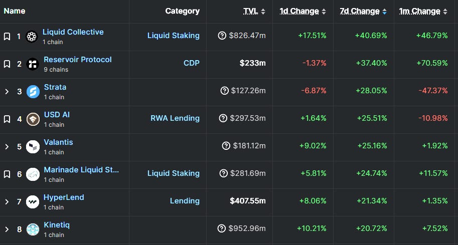 Reservoir Protocol & Liquid Collective — Both are sustaining inflows from last week’s catalysts. Reservoir continues to benefit from looping opportunities on srUSD following its Morpho market incentive additions. Liquid Collective is seeing sustained institutional demand for staked ETH and SOL ETF products from major issuers, including Galaxy, Bitwise, and other SOL and ETH ETF issuers.