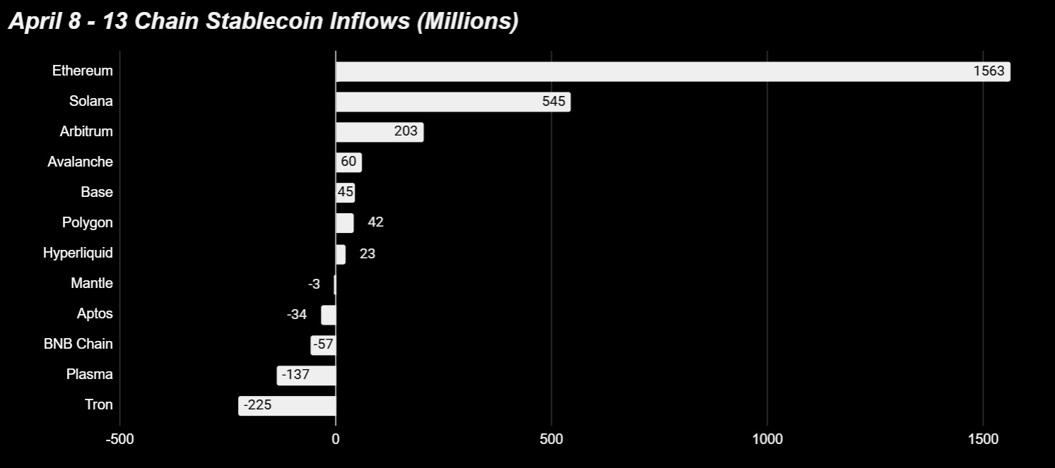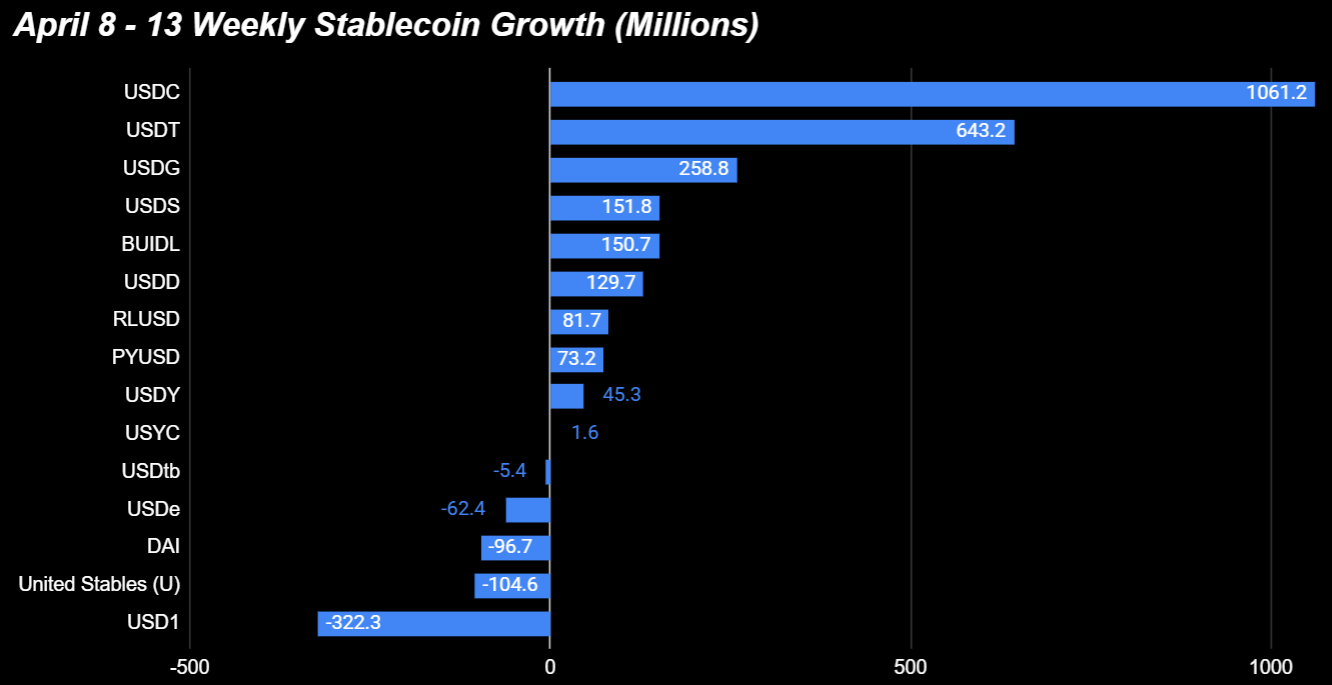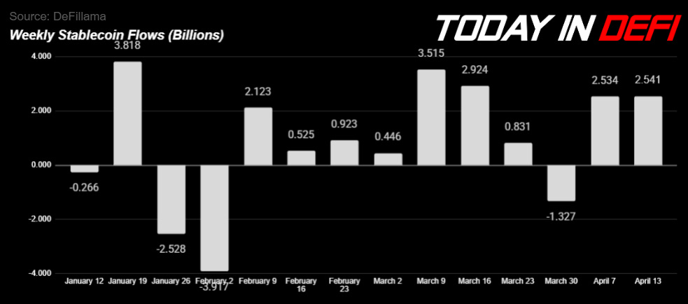 Total stablecoin inflows for the week of April 8–13 came in at +$2.541B — essentially identical to last week’s +$2.534B, both at +0.8% growth. On the surface, this looks like stable, sideways flow. But what’s happening underneath is more interesting.