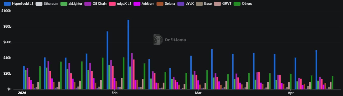 The chart tells a clean story. Hyperliquid (blue) has been the undisputed leader in perps volume every single week since January 2026 — and the gap isn’t closing. Across low-volume weeks and high-volume spikes alike, Hyperliquid consistently prints $40–50B in weekly volume, with two notable spikes in late January and early February pushing toward $75–85B during peak volatility periods.