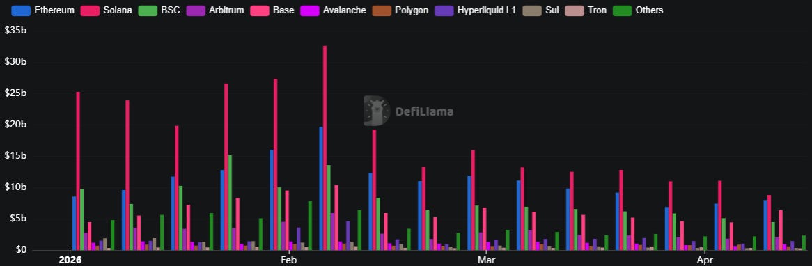 Base's DEX volume surpassed BSC this week — the second time this year, but the first time it means something structurally. The January instance was a single-event spike driven by the FootballFun TGE that collapsed immediately after. This time, it's a convergence from multiple directions: Base has been consistently growing since March, driven by Aerodrome's deepening dominance (~63–80% of Base volume), accelerating USDC inflows (+$65M this week vs. +$30M prior), and the Uniswap/Privy integration announced April 7 routing new app-level swap volume directly onto Base.