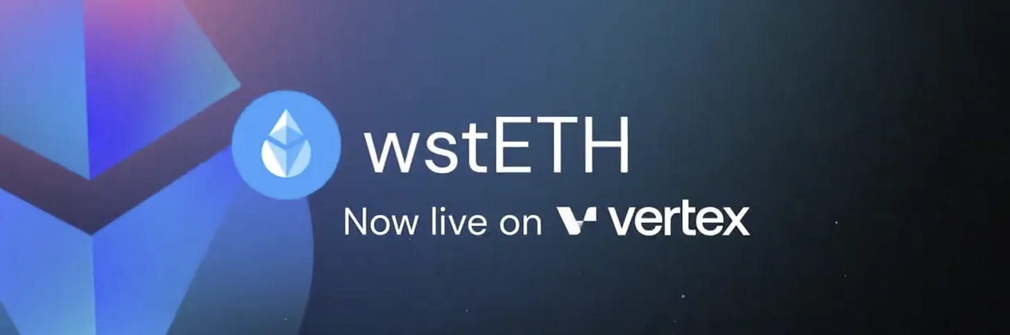 Vertex Protocol has integrated Lido's $wstETH, allowing users to trade, borrow, and earn ETH staking rewards simultaneously. With wstETH, users can maximize efficiency by using it as collateral for spot margin looping, arbitrage strategies, and leveraged trading while continuously earning staking rewards. Strategies like basis trading between wstETH and ETH-PERP enable yield capture through funding rates and spreads.