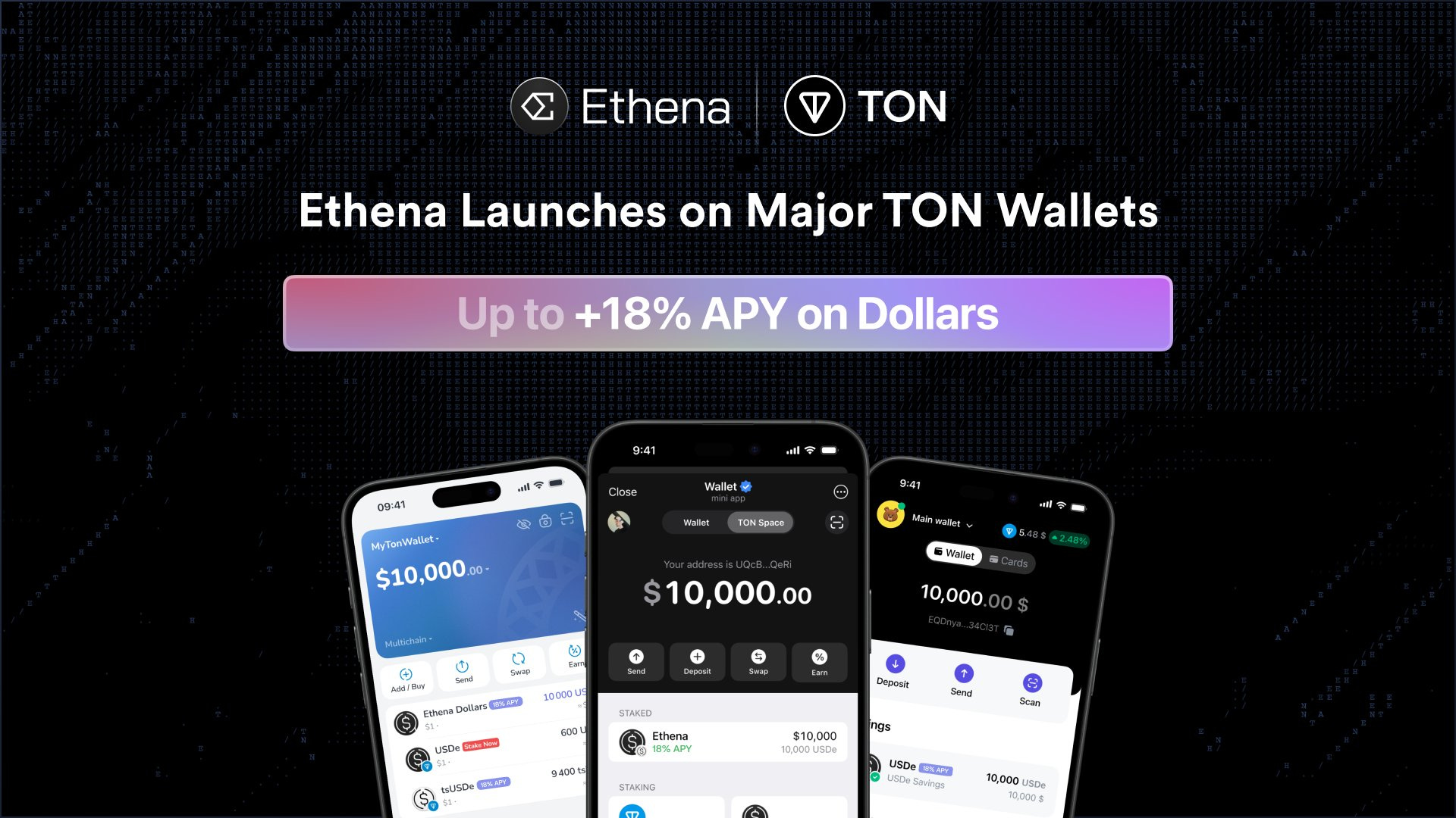 Ethena has launched savings support for USDe on the TON blockchain, offering up to 18% APY via major wallets like TON Space, Tonkeeper, and TONHub. The yield combines ~8% from sUSDe rewards and an additional 10% in TON, distributed weekly.