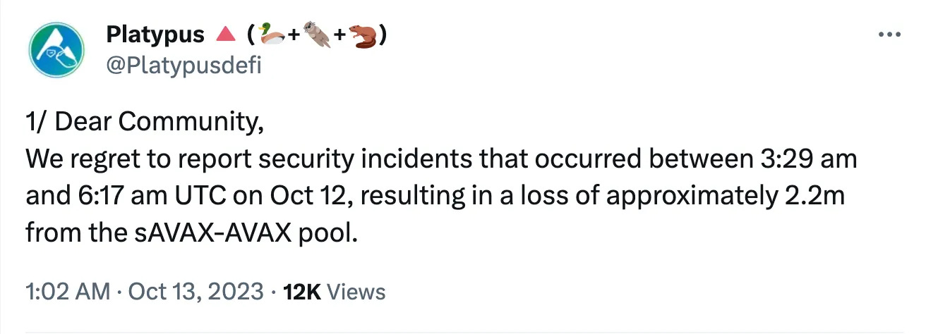 Platypus on Avalanche experienced a flash loan hack and lost 2.2 million. The team is investigating and the liquidity pools have been temporarily halted.Tangible USDR Depeg