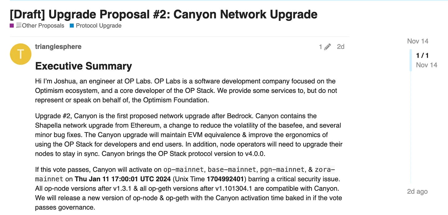 Optimism governance proposes the Canyon network upgrade, the first network upgrade following the Bedrock upgrade.