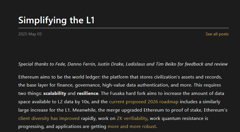 Vitalik outlined a vision for simplifying Ethereum’s protocol to enhance resilience and scalability. Key proposals include a 3-slot finality system to streamline consensus, replacing the EVM with RISC-V for a 100x prover efficiency gain, and moving legacy logic outside of consensus-critical paths. Ethereum also plans to unify components like erasure codes, serialization (via SSZ), and Merkle trees across the stack to reduce complexity and long-term maintenance costs.