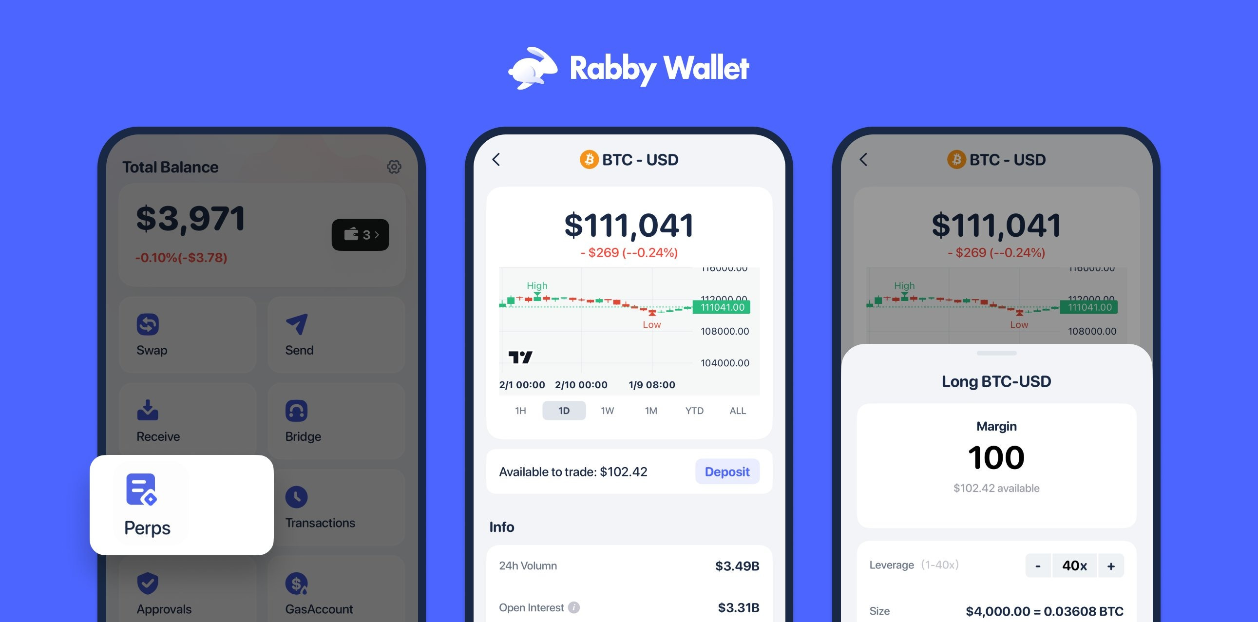 Rabby Wallet launched Rabby Perps on both its mobile app and browser extension, enabling perpetual trading with up to 40x leverage across 100 markets. The feature is powered by Hyperliquid and allows users to take long or short positions directly within the wallet. Perps are available on Rabby Mobile v0.6.35 and Rabby Extension v0.93.47, with users advised to update to the latest versions for access.