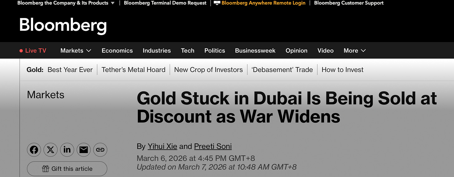Gold is the older answer, and in the early days of the conflict it behaved exactly as the textbooks predict. But the war immediately exposed what the textbooks donโt cover. Dubai handles roughly 20% of global gold flows. When Iranian strikes grounded flights across the Gulf, that pipeline stopped โ precious metals travel in passenger aircraft cargo holds, and with over 21,000 flights cancelled, bullion sat stranded. Gold stuck in Dubai sold at a $30 discount. Logistics costs for rerouted contracts surged 60-70%. The asset was sound. The infrastructure around it wasnโt. And that infrastructure has a deeper structural flaw even in peacetime: goldโs most liquid exit routes โ LBMA settlement, COMEX futures โ are dollar-denominated. The asset may be neutral. Its plumbing is not.