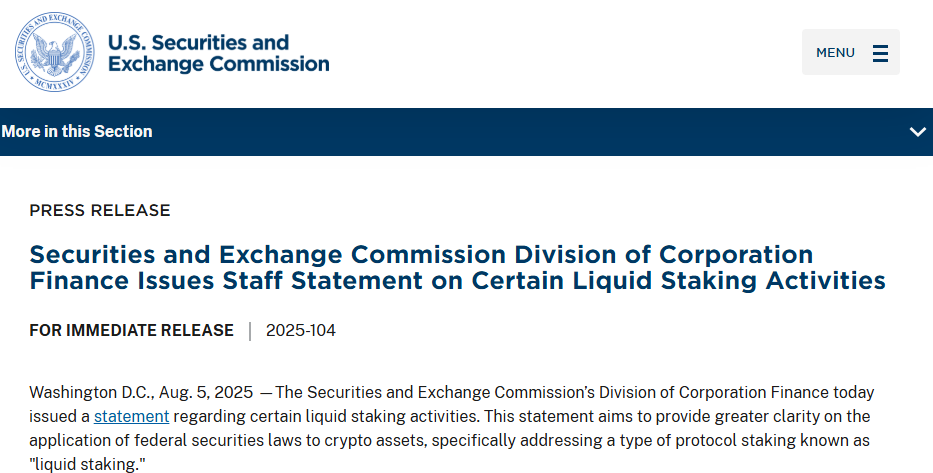 The SEC’s Division of Corporation Finance issued a statement clarifying that certain liquid staking activities may not constitute securities transactions under federal law. The guidance focuses on protocols that issue liquid staking receipt tokens in exchange for staked crypto assets, noting that—depending on the specific facts and circumstances—these activities do not involve the offer or sale of securities under Section 2(a)(1) of the Securities Act of 1933 or Section 3(a)(10) of the Exchange Act of 1934.