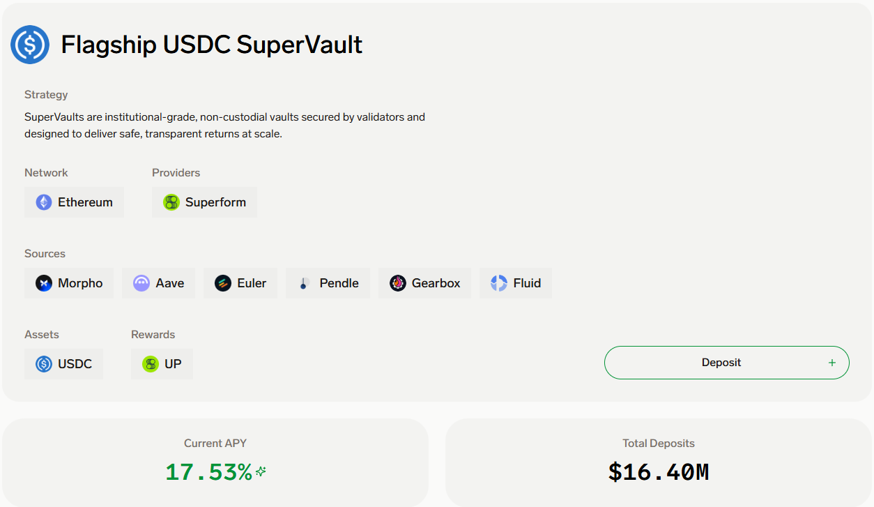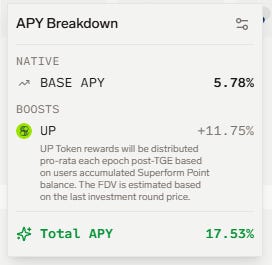 While the vault generates real returns from market activity, the current high APR at ~17% is heavily boosted by the ongoing SuperRewards program. The organic yield is solid, but the headline numbers are temporarily “supercharged” by $UP token incentives and SuperFrens points designed to reward early adopters.