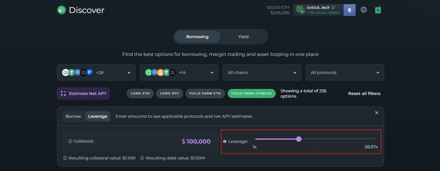 Click on the farm you want to do, go to the leverage tab, and insert your collateral and adjust the leverage you want to farm with.