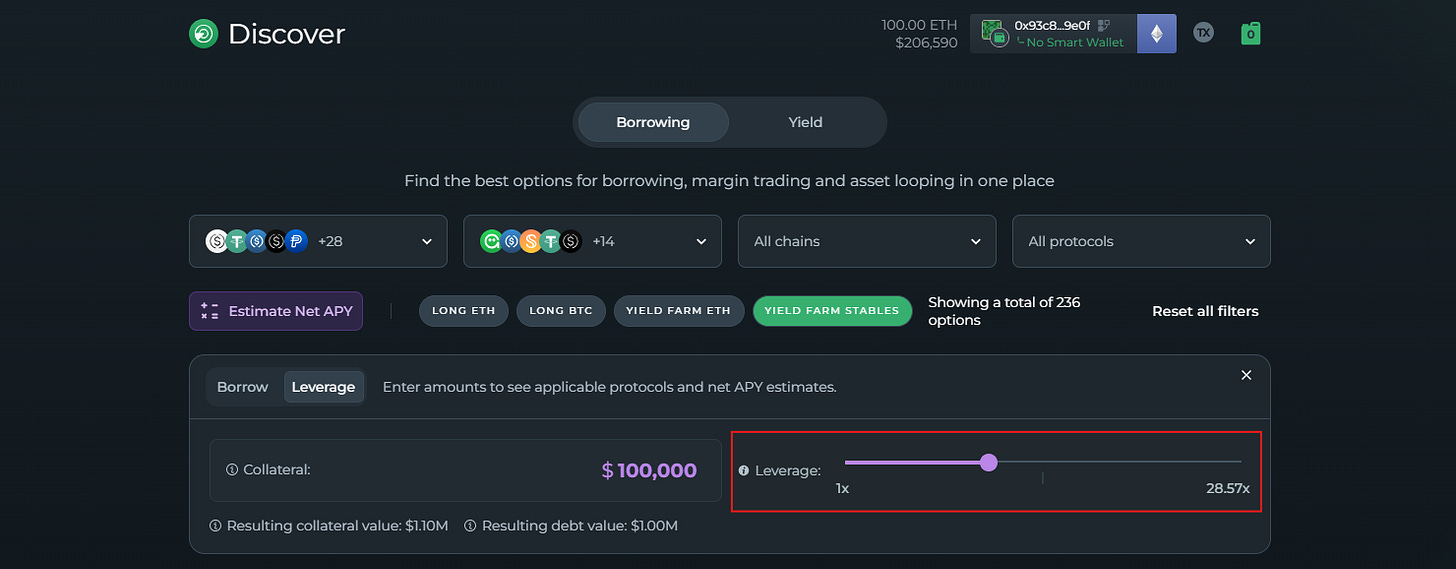 Instead of chasing random APYs across dashboards, DeFi Saver’s Discover page lets you systematically filter, scale, and execute leveraged yield strategies — all in one interface.