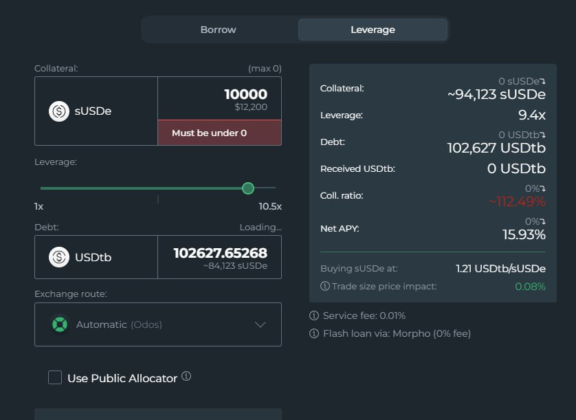 When filtering Morpho stablecoin markets and scaling leverage toward ~11x, you can identify setups like sUSDe supplied against USDtb at up to ~91.5% max LTV.