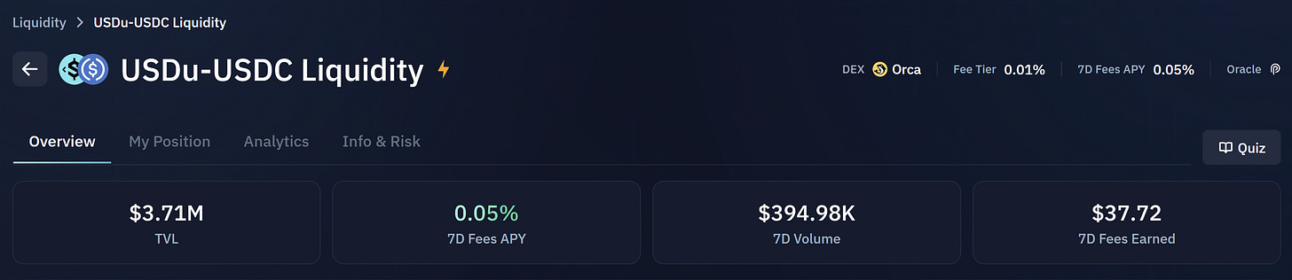 Potential Concerns: Newer stablecoin — less than 3 months old, with a smaller $3.71M pool. Structurally sound (1:1 fiat-backed, central-bank approved, UAE bank custody) so the backing quality is high. The risk isn’t the backing — it’s the shorter track record and thinner secondary liquidity. Peg hasn’t been stress-tested in a major market event yet. Size smaller than you would for USDS or PYUSD pools until the track record builds.