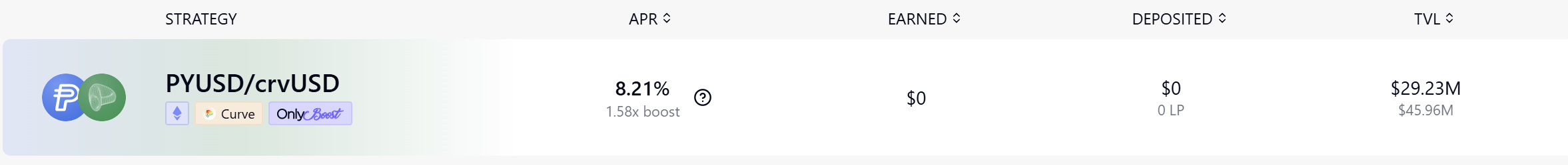 What it is: PayPal’s PYUSD (issued by Paxos, fully regulated under NYDFS, backed 100% by cash and short-duration US Treasuries) paired with crvUSD.