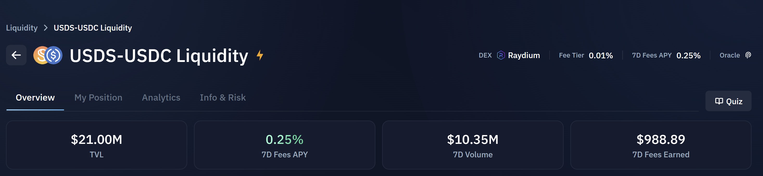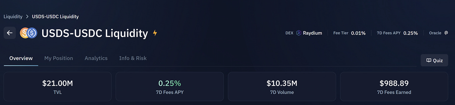 Potential Concerns: Low trading-fee contribution — most yield is USDS incentives, which can taper. Concentrated liquidity can go out-of-range during sharp moves (Kamino auto-rebalances but there’s some drag). Two of the most established stables = very low peg risk. Good base-layer allocation.