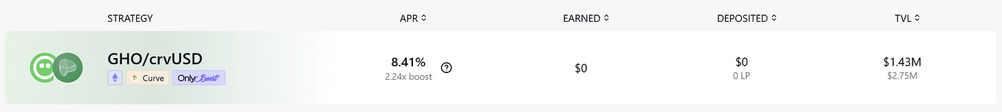 What it is: Two of the cleanest decentralized stables in DeFi. GHO is Aave’s native stablecoin (overcollateralized by crypto you lock in Aave). crvUSD is Curve’s own stablecoin (also overcollateralized, mostly by ETH and LSTs). Neither has Ethena exposure.