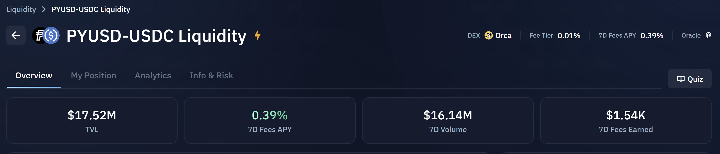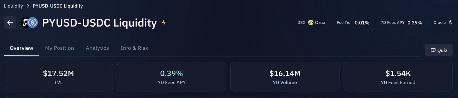What it is: Paxos’ PYUSD paired with Circle’s USDC on Orca.