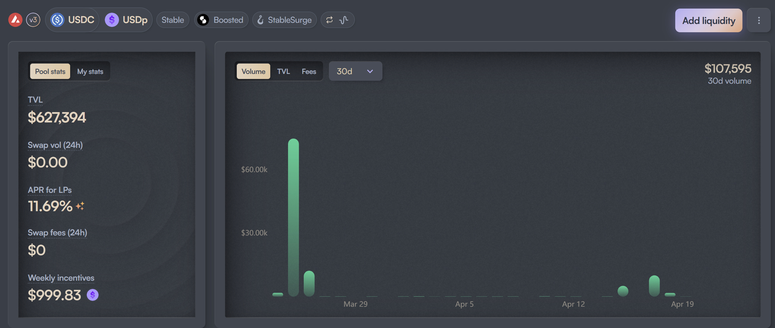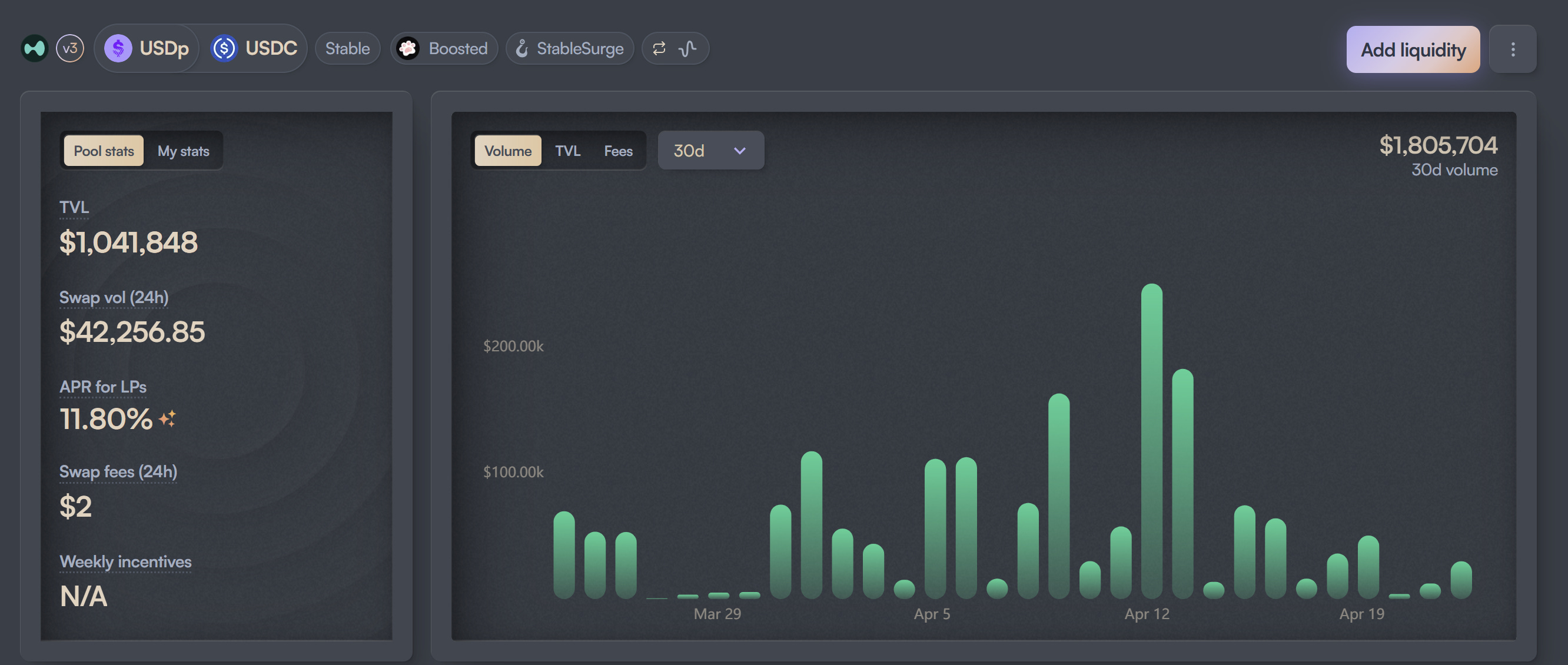 What it is: Same USDp/USDC pair, different reward construction — uses USDp-native emissions instead of Merkl bribes.
