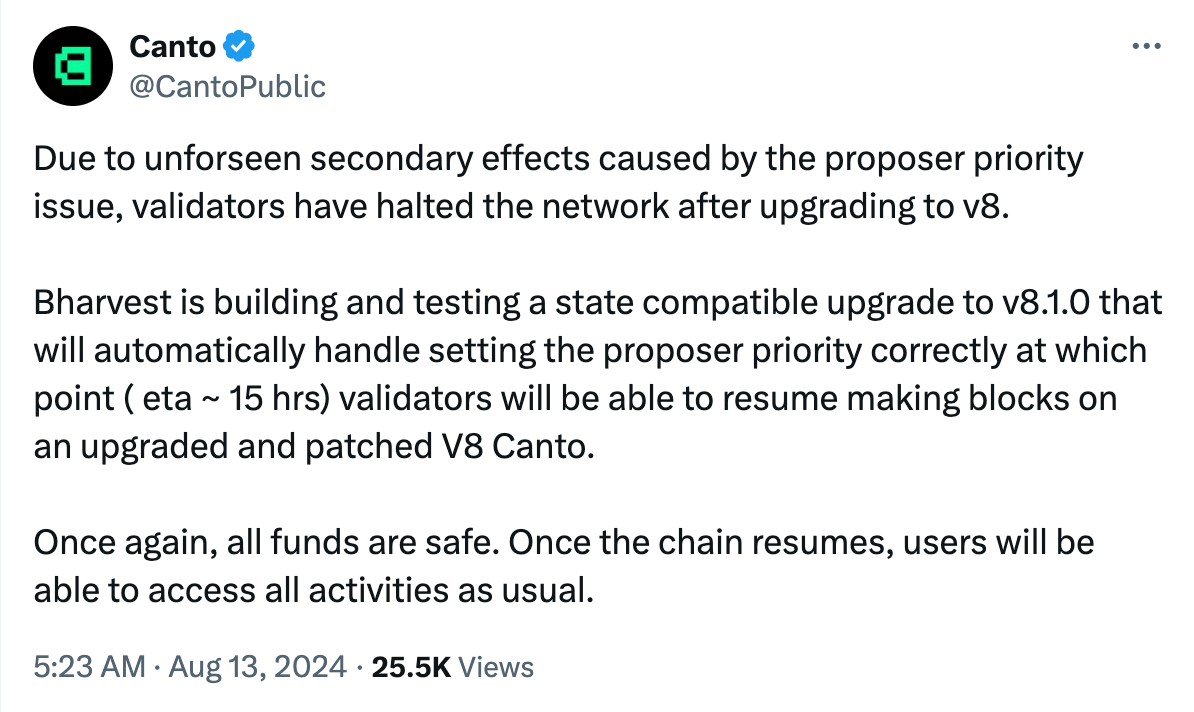 Canto, a Layer 1 blockchain, has experienced a pause following its upgrade to v8 due to proposer priority issues. Bharvest is working on a patch (v8.1.0), which is expected to be available in about 15 hours. Validators plan to resume their activities once the patch is implemented.