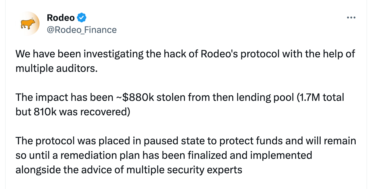 Arbitrum-based leveraged farming protocol Rodeo was attacked for $880k due to oracle dependency. Rodeo has paused the protocol while investigating, and is asking the hacker to return stolen funds.