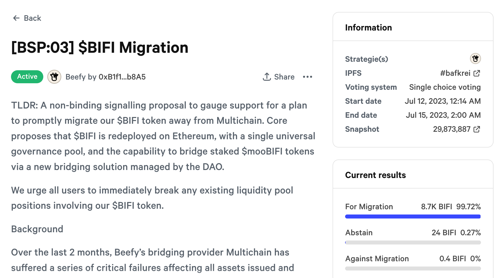 Beefy DAO is taking a signalling vote to migrate away from Multichain by redeploying $BIFI on Ethereum.