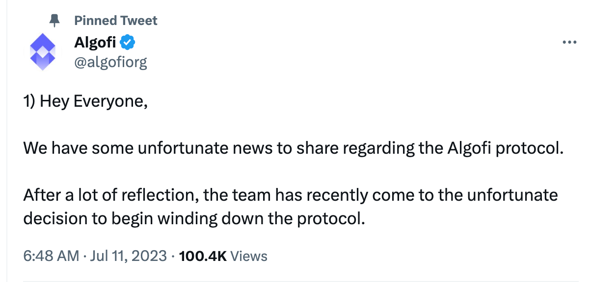 Algorand-based lending protocol Algofi, holding 55% of Algorand TVL, announces it will wind down the protocol due to the non-viability of its current business model. The Algofi website is now in withdraw-only mode.