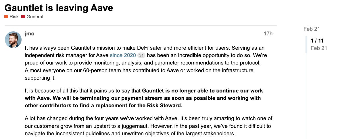 Gauntlet, an independent risk manager to Aave, is leaving Aave as the team "found it difficult to navigate the inconsistent guidelines and unwritten objectives" of Aave's "largest stakeholders."