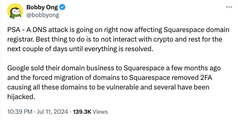 Multiple crypto projects had their domains hijacked following a DNS attack targeting web hosting service provider Squarespace. Over 220 DeFi apps with a Squarespace domain, such as Compound, Pendle, Celer, etc. front-ends are at risk and users are suggested to avoid using them before projects secure their domains.