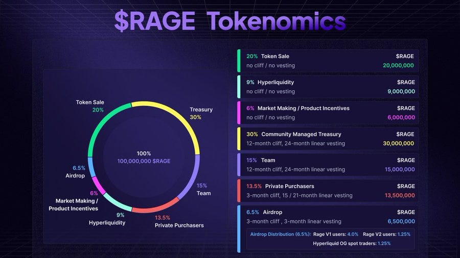 Rage Trade releases the RAGE tokenomics, with 6.5% distributed to airdrop receivers including V1 &V2 users and Hyperliquid OG spot traders.