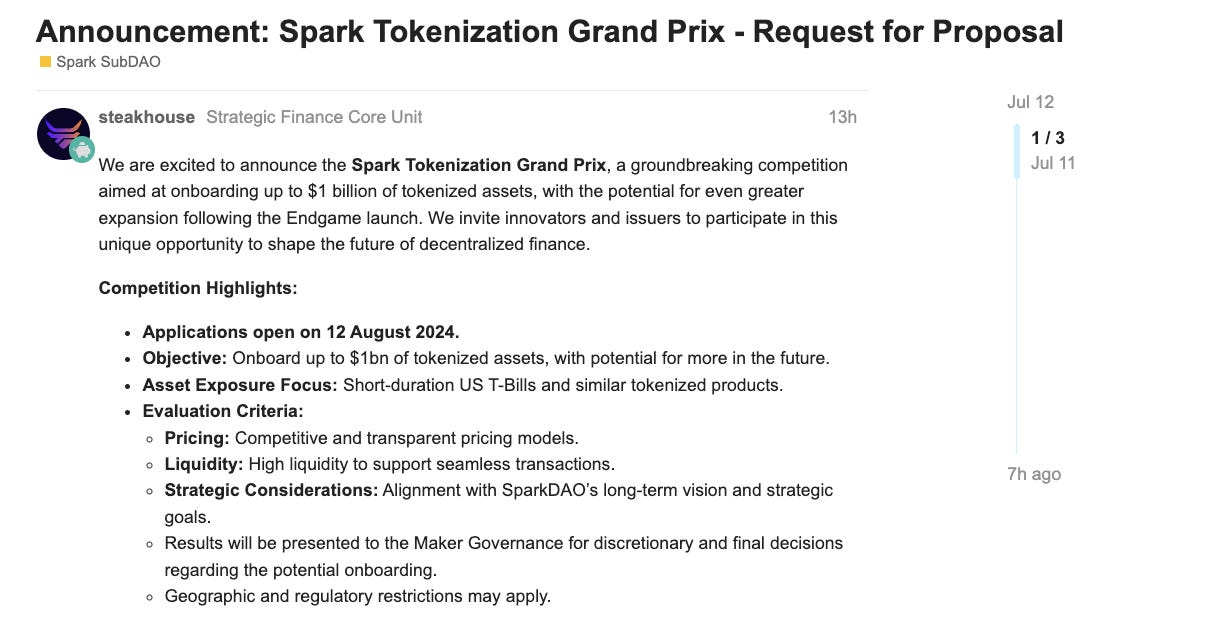 Spark Lend announces Spark Tokenization Grand Prix, an open competition to onboard $1 billion in tokenized RWAs to MakerDAO. Applications will open from August 12.