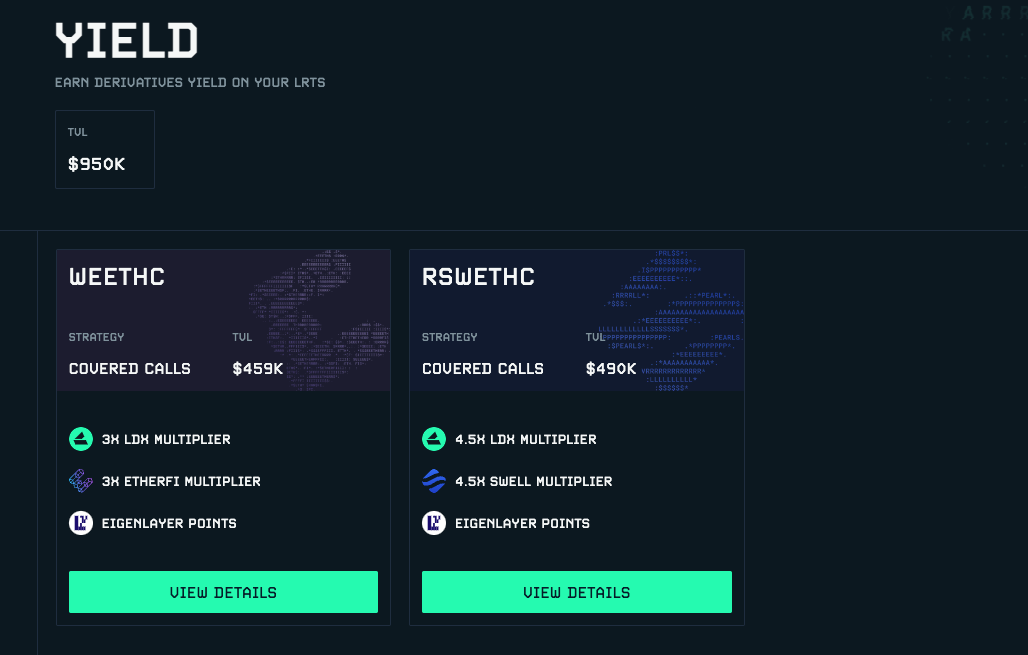 Lyra launched C-Token (covered call tokens), the first tokenized derivative that earns yield from options premiums, ETH staking rewards, EigenLayer points, boosted re-staking points, and Lyra points. Users can now deposit weETH and rswETH to start earning yields.