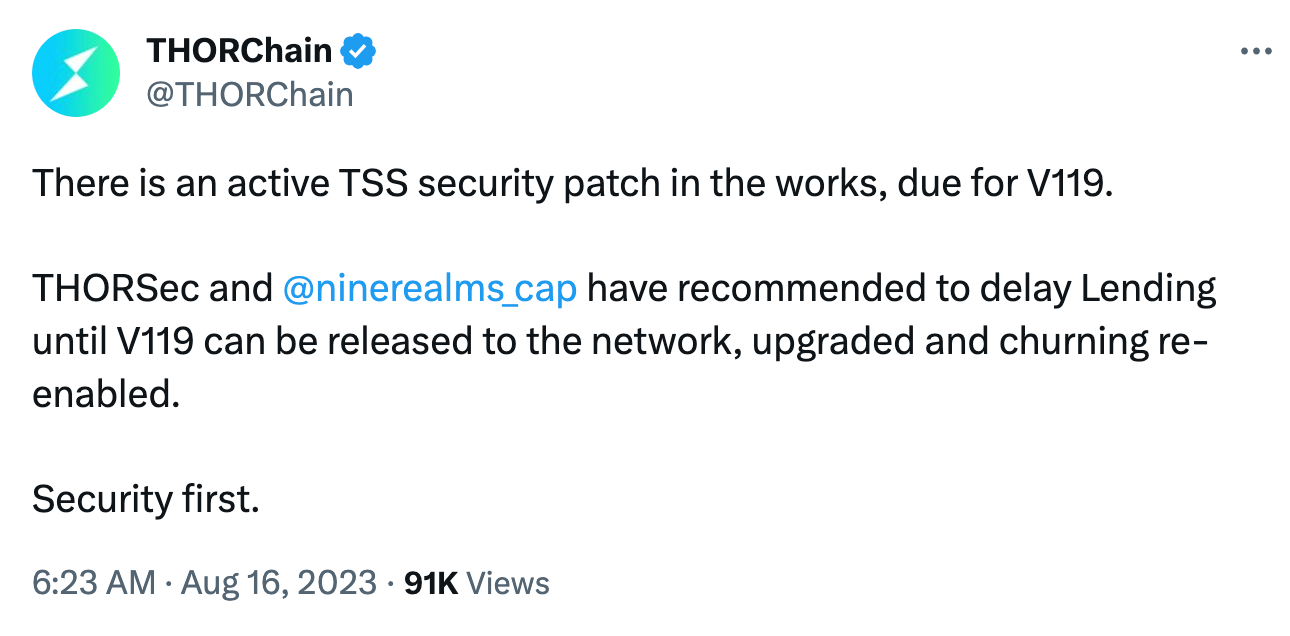 Thorchain devs recommend delaying the launch of ThorFi lending due to a security patch in the works. Thorchain is using a Binance Tss library with a vulnerability to be patched.
