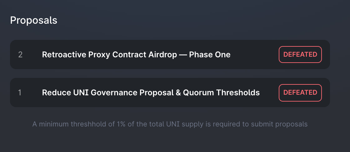 In another, similar situation, a proposal to retroactively grant an airdrop to users of wallets and third party tools that interacted with Uniswap failed. Just like the other proposal, there was a large number of yes votes, but the proposal failed due to lack of quorum (both dictionary and Uniswap definition this time.)