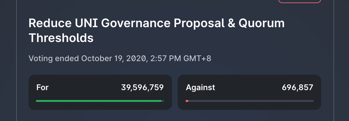 The first proposal was to reduce the quorum - the threshold for votes to activate a proposal. However, despite reaching the dictionary definition of quorum, Uniswap’s “quorum” is defined as the number of yes votes.