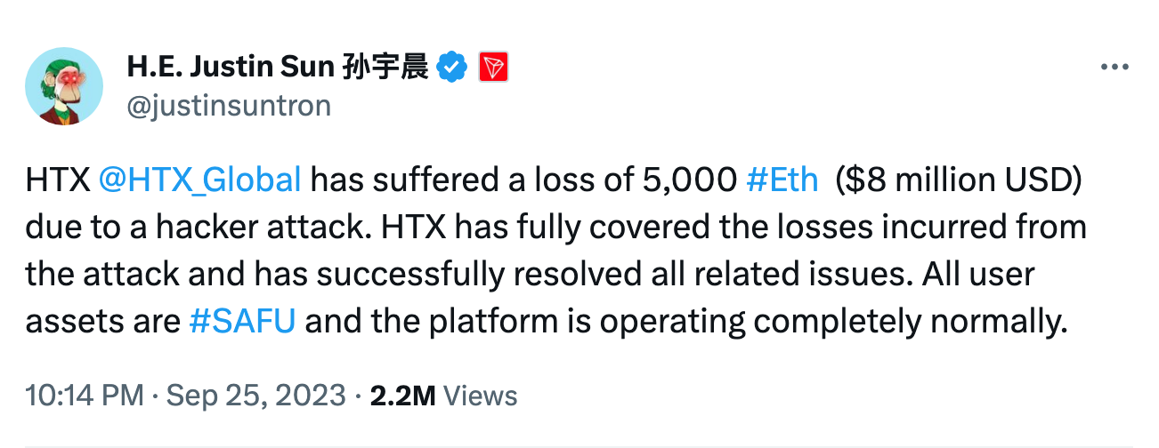 HTX was hacked and lost 5,000 ETH (~$8M). The loss has been covered and issues have been resolved according to HTX advisor Justin Sun.