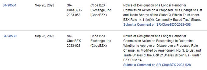 The SEC has delayed decisions on the proposed Bitcoin ETF applications from ARK 21Shares and Global X. The next deadline for reviewing ARKβs ETF is now Jan 10, 2024 (originally Nov 11, 2023), and Nov 21 for Global X (originally Oct 7).
